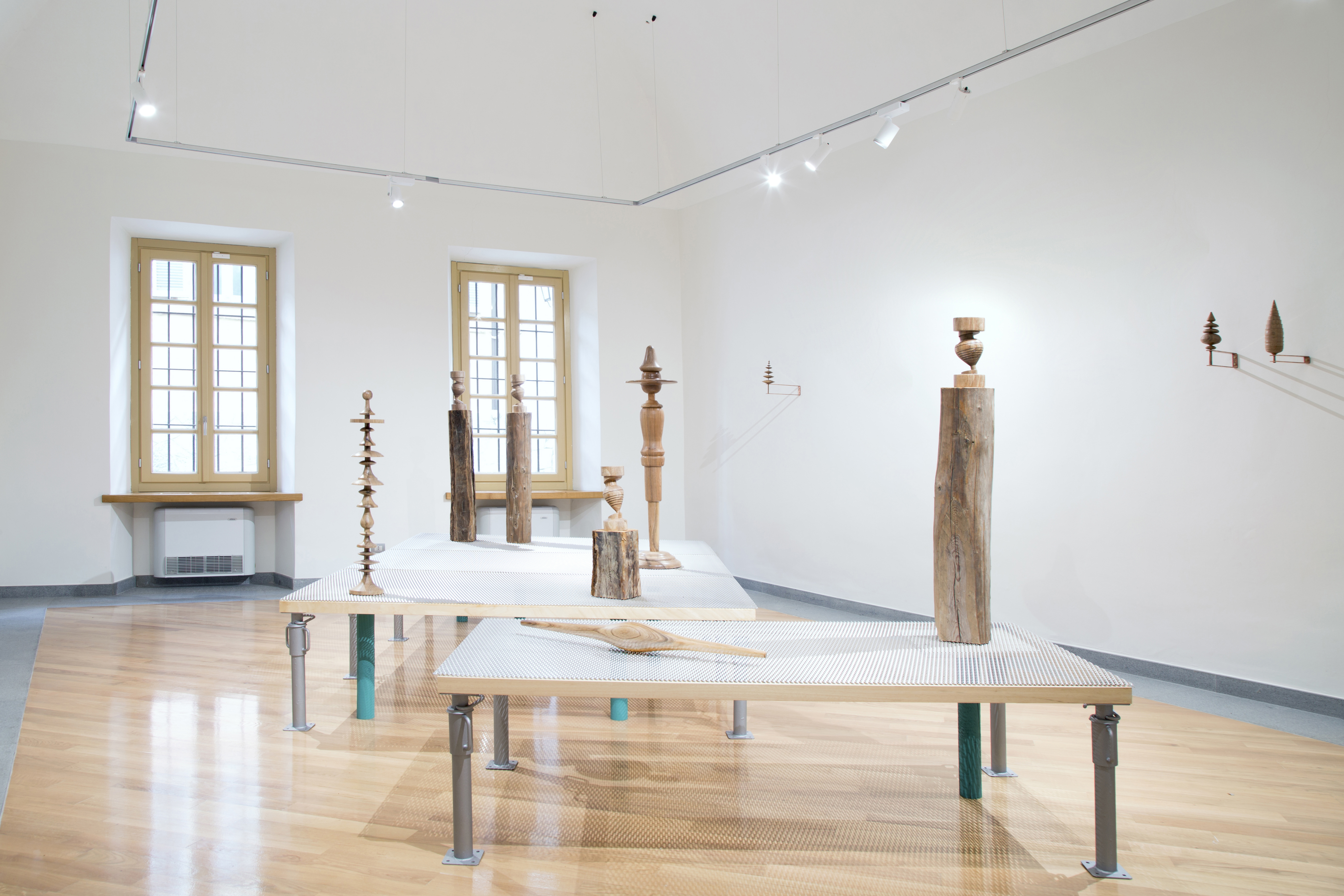La mostra temporanea Cime di alberi e gambe di tavolo di Jacopo Rinaldi, è frutto della residenza d’artista che, partendo dagli oggetti della cultura materiale conservati nei musei etnografici e ispirandosi alle feste e ai riti, passati e presenti, del territorio valsusino, ha dato vita a una serie di opere che integrano la tradizione artigianale con un'analisi sulla forma archetipica. Rinaldi, rintraccia nella rotazione un principio ricorrente dell’artigianato del territorio: dal fuso per filare a mano sino alla trottola, passando per i fusi danzanti (come la Pouento di Chiomonte), cime di conifere utilizzate nei riti arborei e nelle processioni religiose, dai tempi antichi sino ad oggi. Le sculture lignee esposte in mostra diventano forme essenziali, che connettono passato e contemporaneità, rito e gioco, tecnica e narrazione.