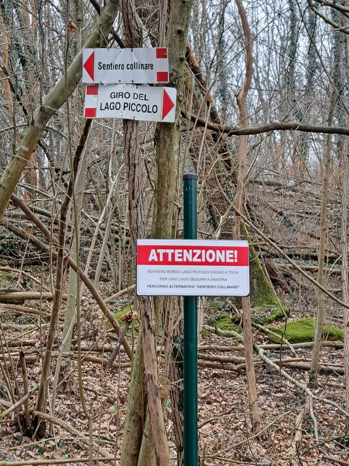 Lungo il percorso, il Comune di Avigliana ha apposto una serie di cartelli con cui si comunica l'interruzione dell'itinerario "Giro del Lago Piccolo" e si propone in alternativa la salita al "Sentiero Collinare".