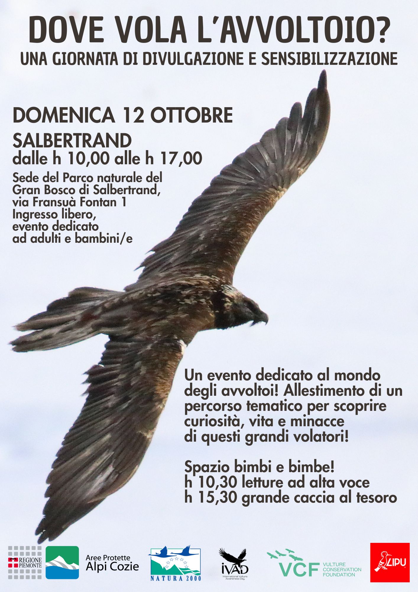 Domenica 12 ottobre le Aree Protette delle Alpi Cozie organizzano una giornata di divulgazione e sensibilizzazione sugli avvoltoi. Presso la sede del Parco Naturale del Gran Bosco di Salbertrand, sarà allestito un percorso tematico e verranno organizzate attività, incontri e giochi per coinvolgere il pubblico sull’importanza di tutelare i rapaci necrofagi nel territorio alpino. Le guide  Parchi delle Alpi Cozie e i guardiaparco saranno a disposizione di adulti e bambini per illustrare biologia, caratteristiche e curiosità di questi straordinari veleggiatori che sempre più di frequente si possono osservare nei cieli delle valli di Susa, Chisone e Sangone. Sarà anche possibile osservare da vicino alcuni individui di gipeto, grifone e avvoltoio monaco tassidermizzati, provenienti dalla collezione del Museo Regionale di Scienze Naturali di Torino che li ha gentilmente messi a disposizione.