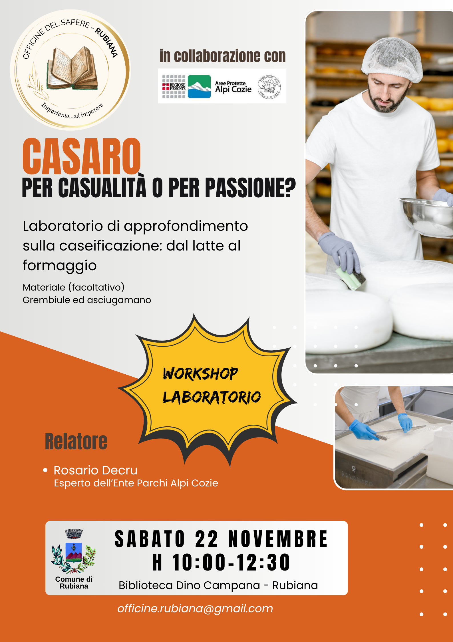 Le Officine del Sapere di Rubiana, in collaborazione con Parchi Alpi Cozie, propongono sabato 22 novembre "Casaro per casualità o per passione?" .