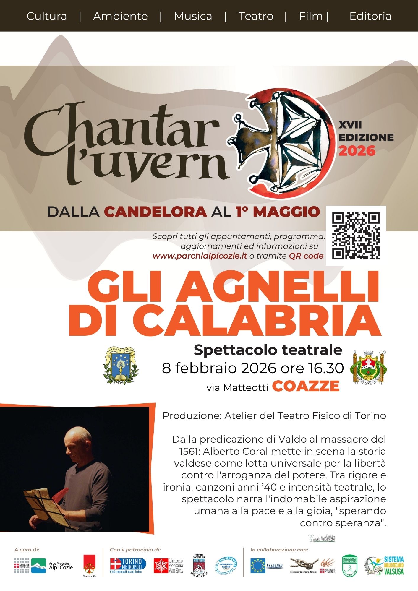 Domenica 8 febbraio 2026 alle ore 16.30 a Coazze presso il tempio valdese in via Matteotti spettacolo teatrale Gli agnelli di Calabria.