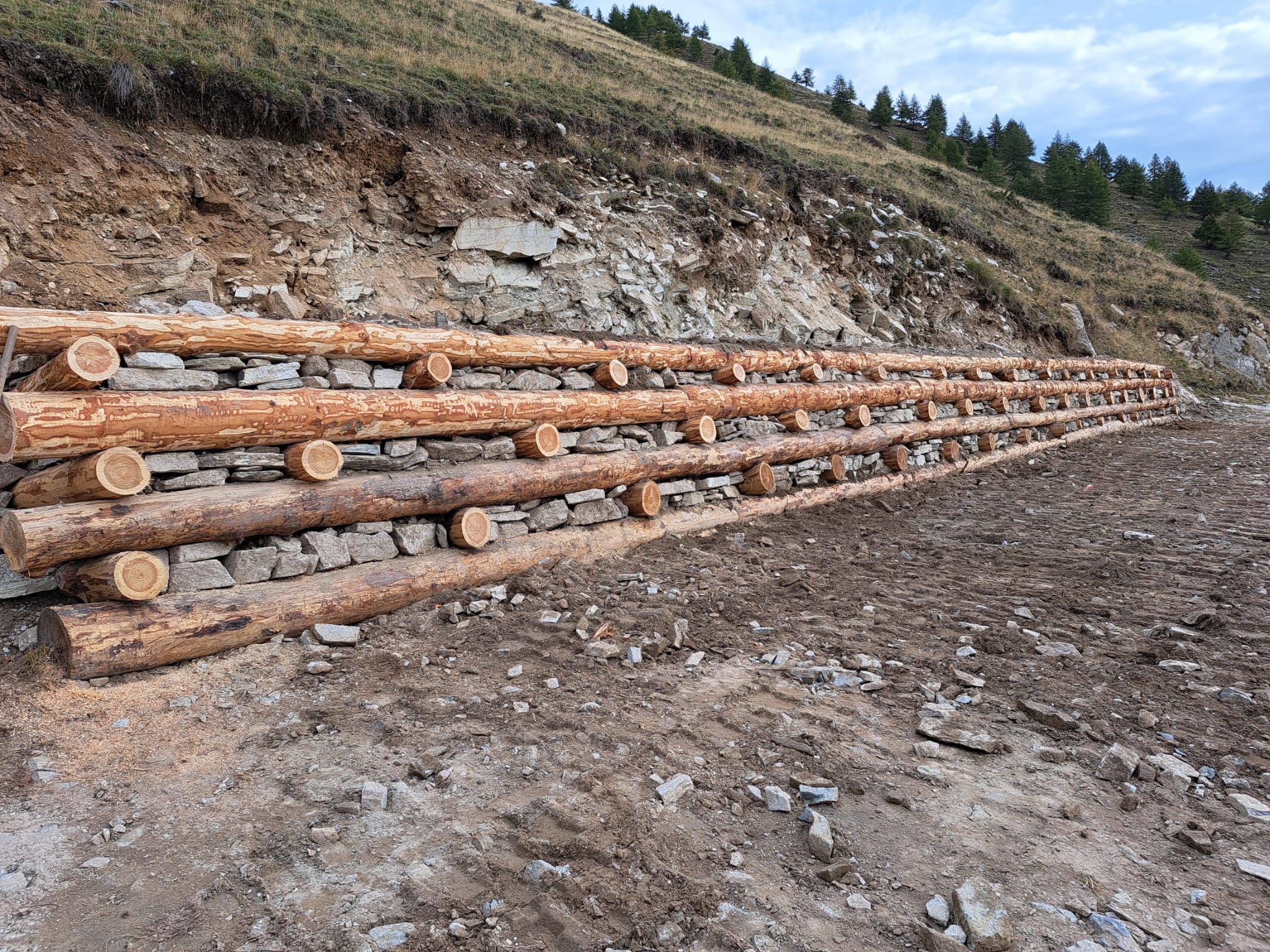 Si è proceduto dapprima con gli interventi di regimazione delle acque tramite il rifacimento delle canalette di scolo lungo l’intera tratta, il rimodellamento e la manutenzione di canalette longitudinali a terra già esistenti e il rifacimento degli attraversamenti dei due rii nella zona delle Bergerie Jouglard. In seguito si è realizzata una palificata doppia a sostegno di un versante instabile: questo tipo di intervento è stato effettuato privilegiando soluzioni di ingegneria naturalistica che prevedevano l’utilizzo di larice locale certificato PEFC, prelevato da un cantiere forestale a pochi chilometri di distanza.