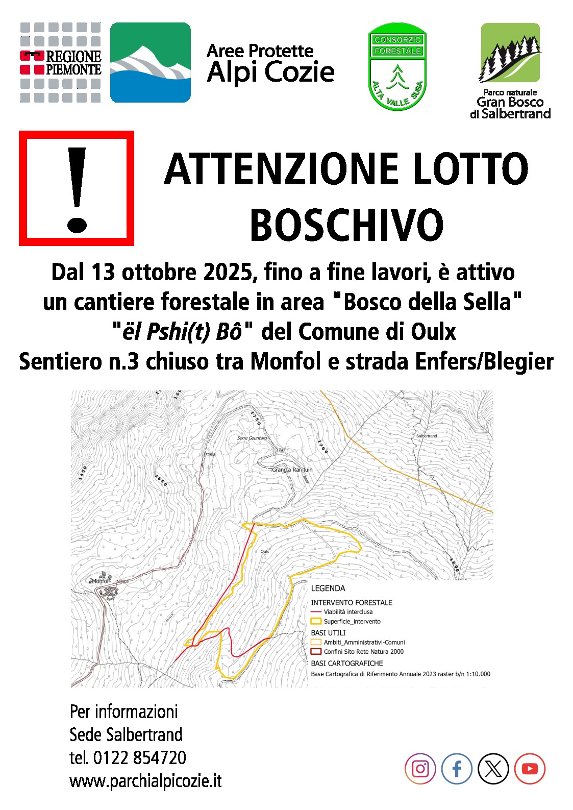 Proseguono i lavori nel cantiere forestale in area "Bosco della Sella - ël Pshi(t) Bô" lungo il Sentiero n. 3 del Parco naturale del Gran Bosco di Salbertrand sopra Monfol in Comune di Oulx.