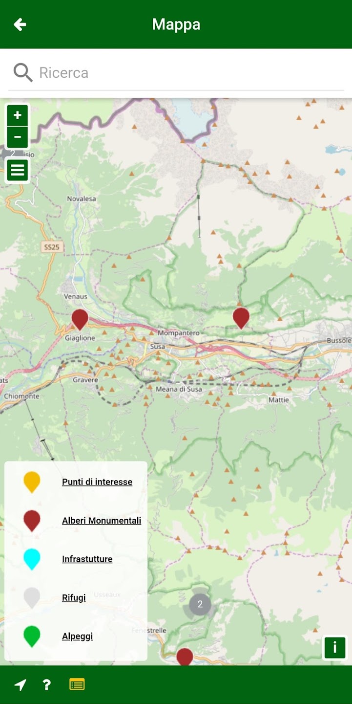 Naviga sulla Mappa scegliendone lo sfondo che preferisci ed esplora punti d’interesse storico – culturale (architetture militari, avvenimenti storici, beni religiosi, siti di cultura materiale, edifici storici, fontane monumentali, meridiane), alberi monumentali, infrastrutture (aree attrezzate, parcheggi, punti acqua), rifugi, alpeggi.