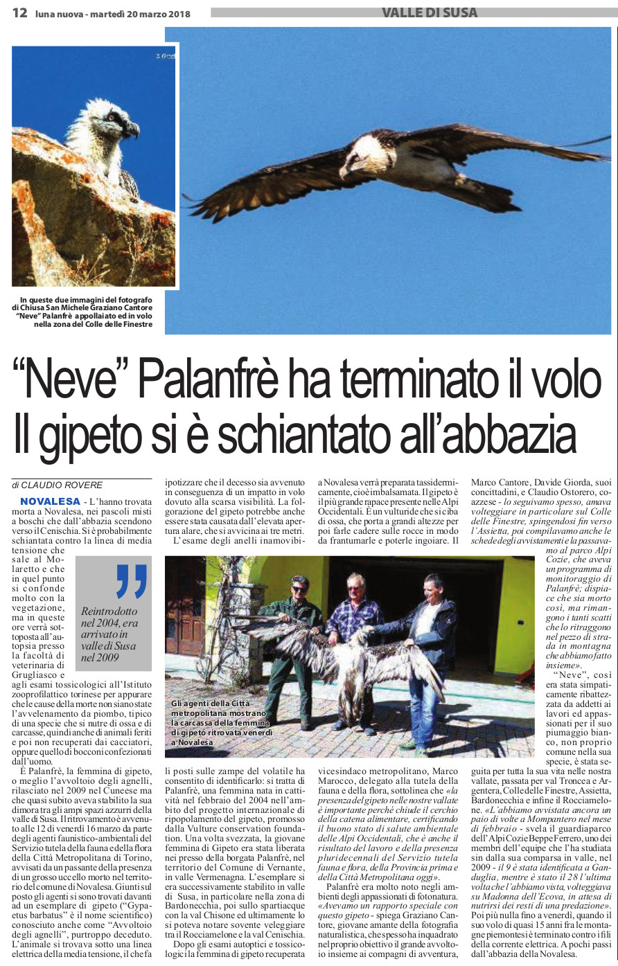 "Neve" Palanfrè ha terminato il volo Il gipeto si è schiantato all'abbazia