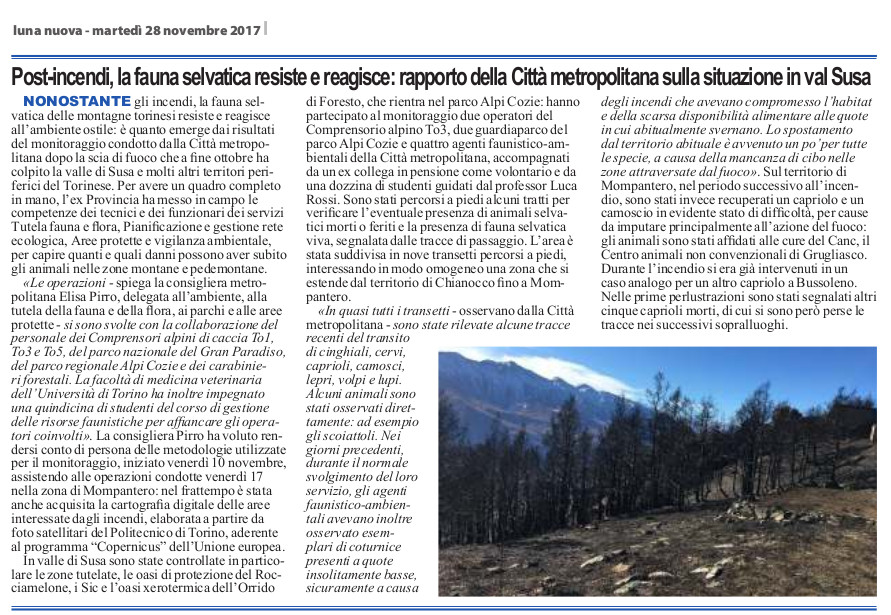 Post-incendi, la fauna selvatica resiste e reagisce: rapporto della Città metropolitana sulla situazione in Val Susa